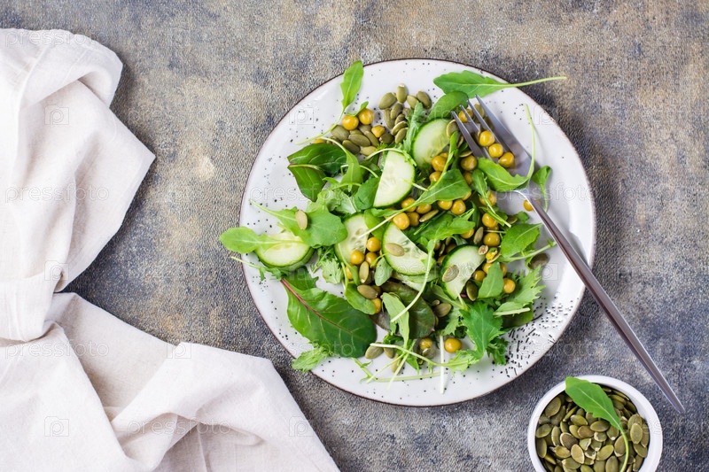 Вегетарианский зеленый салат с огурцом, горохом и рукколой, мизуной и листьями мангольда и вилкой на тарелке на столе. Витамин и здоровое питание. Флексетарианская диета. Вид сверху. Копировать пространство