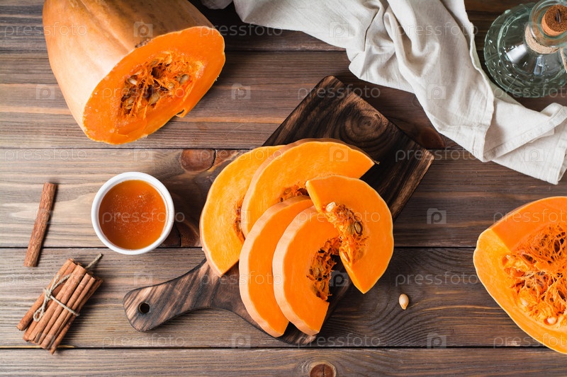Кусочки спелых тыквенных семечек на разделочной доске, мед и корица на деревянном столе. Вегетарианская пища. Деревенский стиль. Вид сверху