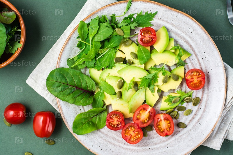 Свежий салат с авокадо, помидорами черри, рукколой, мизуной, мангольдом и семенами тыквы на тарелке на зеленом фоне. Вегетарианская витаминная пища. Вид сверху. Крупный план