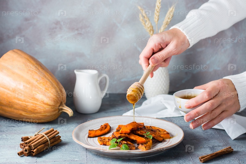 Женские руки поливают медом запеченные ломтики тыквы, готовые к употреблению, на тарелке на столе. Вегетарианская пища. День Благодарения