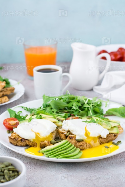 Здоровый обед. Тост с вареными яйцами, кусочками авокадо, рукколой, мизуной и листьями мангольда и помидорами черри на тарелке на сервированном столе. Флексетарианская диета. Вертикальный вид
