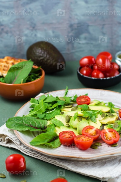Готовый к употреблению салат с авокадо, помидорами, листьями рукколы, мизуной, мангольдом и семенами тыквы на тарелке на зеленом фоне. Вегетарианская витаминная пища. Вертикальный вид