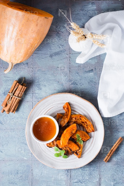 Запеченные ломтики тыквы, готовые к употреблению, и мед на тарелке на столе. Вегетарианская пища. День Благодарения. Верхний и вертикальный вид