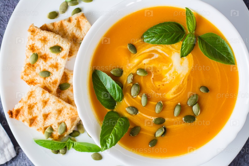 Готовый суп-пюре из тыквы с тыквенными семечками, листьями базилика и тостами в тарелке на столе. Вегетарианская пища. День Благодарения. Вид сверху. Крупный план