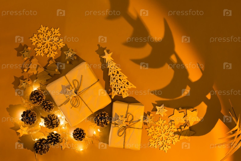 Рождество на закате. Подарки, гирлянда с оленями, украшения, снежинки и тень дерева в теплом оранжевом свете. Вид сверху