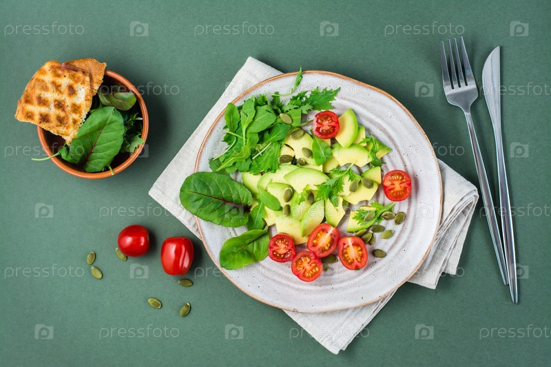 Свежий салат с авокадо, помидорами черри, рукколой, мизуной, мангольдом и семенами тыквы на тарелке на зеленом фоне. Вегетарианская витаминная пища. Вид сверху