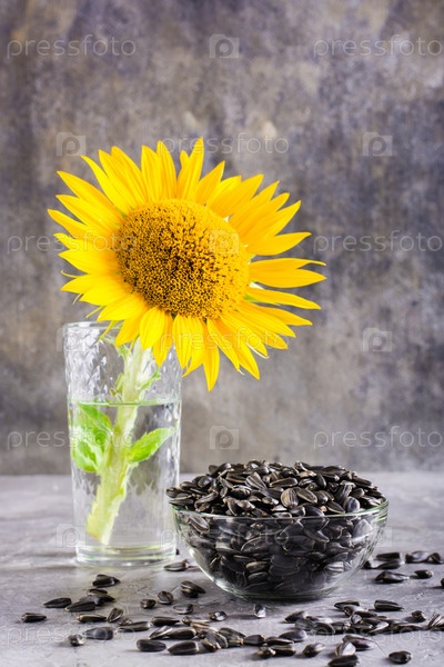 Семена подсолнуха и цветок в стакане на сером столе. Урожай и натуральное питание. Вертикальный