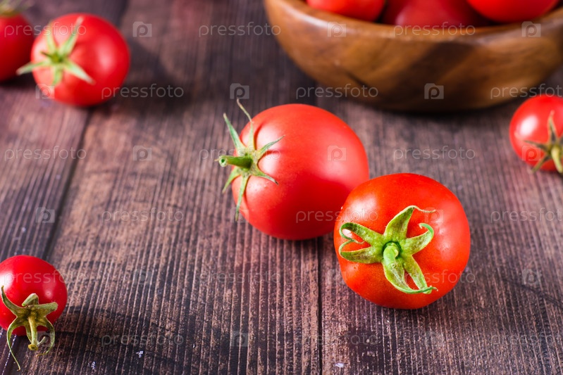 Спелые органические помидоры на деревянном столе. Урожай и местные продукты