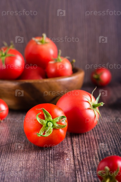 Свежие целые помидоры на деревянном столе и в миске. Органическая еда. Вертикальный вид
