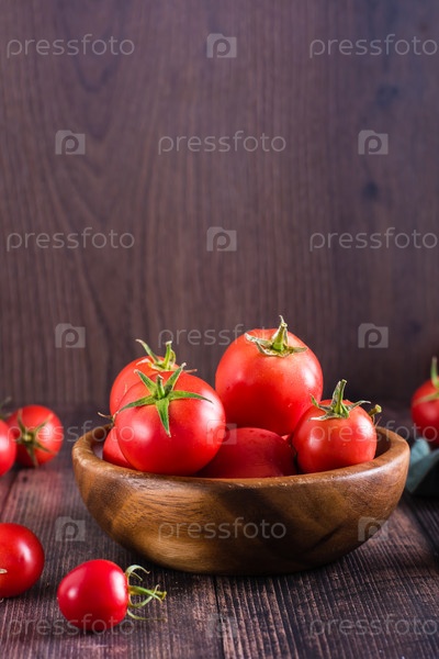 Органические спелые помидоры в миске на деревянном столе. Урожай и местные продукты. Вертикальный вид