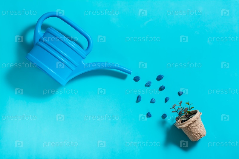Лейка поливает ростки в горшке на синем фоне