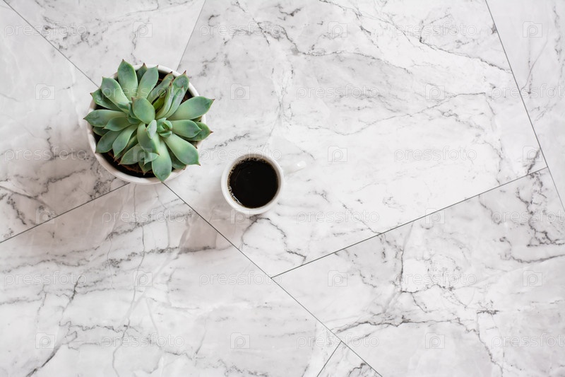 Суккулент в горшке и чашка черного кофе на мраморной плитке. Спокойствие и комфорт
