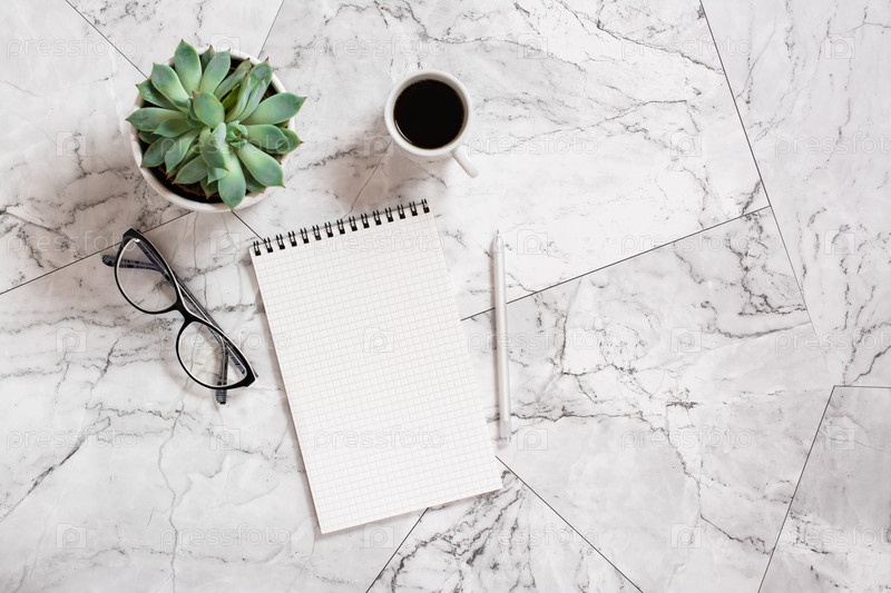 Блокнот, ручка, очки, суккулент и чашка черного кофе на мраморной плитке