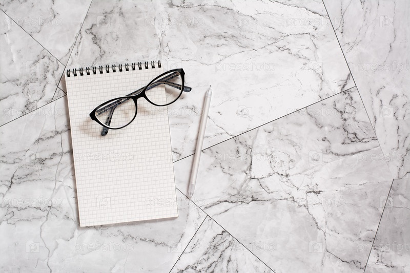 Блокнот, очки и ручка на мраморной плитке. Пауза в работе. Скандинавский дизайн дома