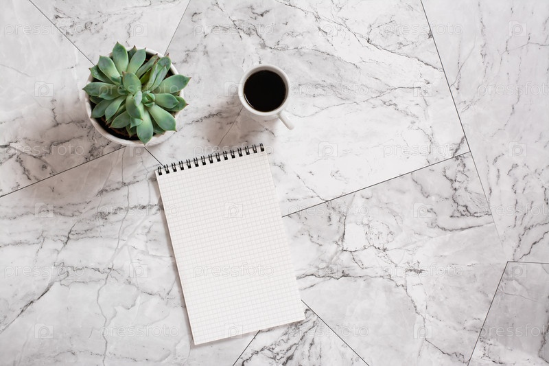 Блокнот, суккулент в горшке и чашка черного кофе на мраморной плитке. Планирование и напоминание