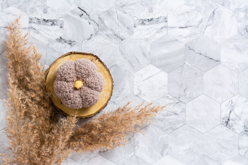 Вязаная тыква на срезе ствола дерева и сухие колосья на мраморном фоне