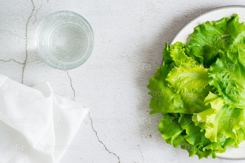 Свежие листья салата на тарелке и стакан воды на столе. Здоровое питание на детокс-диете. Вид сверху