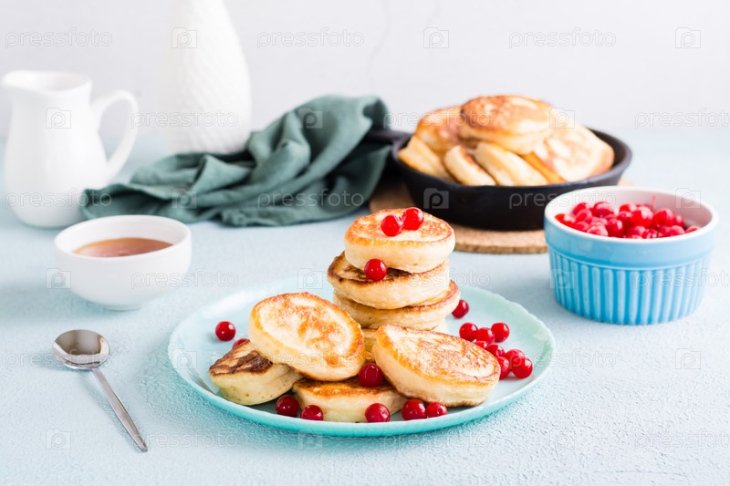 Готовые к употреблению блины и клюква на тарелке и сковороде с блинами на столе. Домашний десерт на завтрак