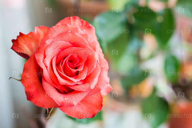 Бутон свежей красной розы в воде падает на размытом фоне зеленых листьев. Цветочный образ жизни