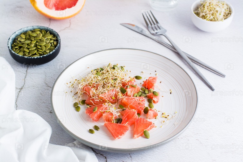 Свежий салат из ростков грейпфрута, клевера и люцерны, тыквенных семечек и столовых приборов на тарелке на столе. Органическая вегетарианская пища для детоксикации