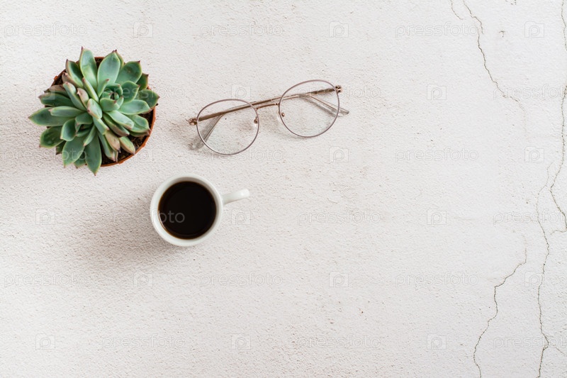 Чашка кофе, стаканы и сочные на светлом фоне. Домашнее рабочее место. Эко образ жизни