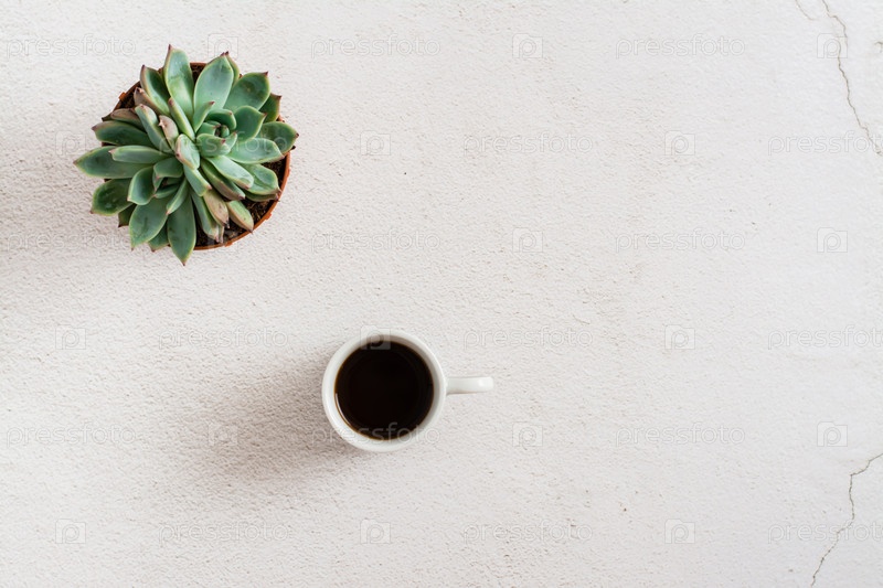Чашка кофе и сочные на светлом фоне. Домашнее рабочее место и перерыв. Эко образ жизни. Копировать пространство