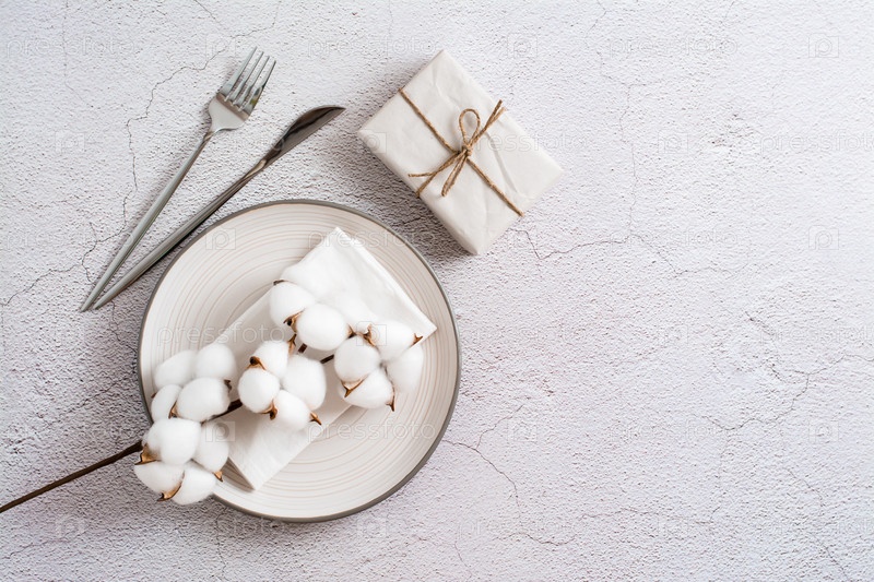Тарелка, столовые приборы, подарок и хлопковая ветка на текстурированном сером фоне. Эко сервировка. Вид сверху
