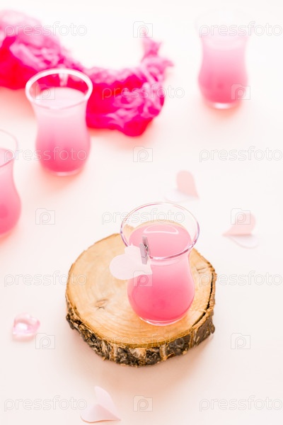 Розовые коктейли в стаканах и бумажные сердечки на розовом фоне. Напитки для влюбленных. Вертикальный вид