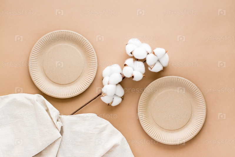 Картонные тарелки и ветка хлопка на бежевом фоне. Экологически чистая и безотходная концепция. Вид сверху