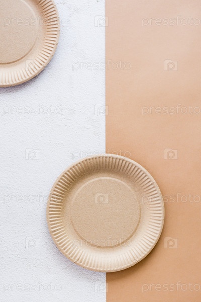 Концепция экологически чистой посуды для еды. Картонная тарелка на двухцветном фоне. Вид сверху и вертикальный