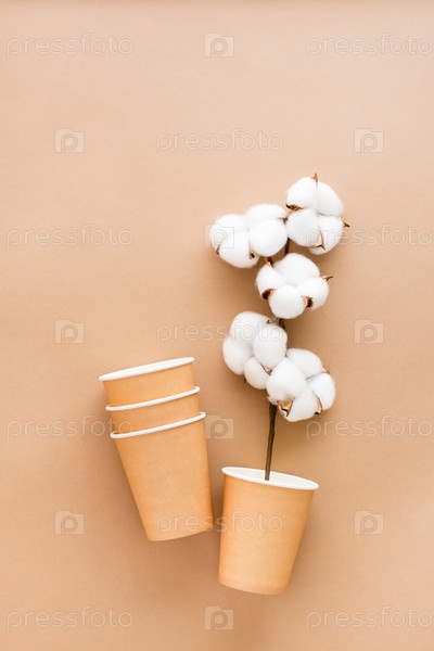 Картонные чашки и ветка хлопка на бежевом фоне. Экологически чистая и безотходная концепция. Вид сверху и вертикальный