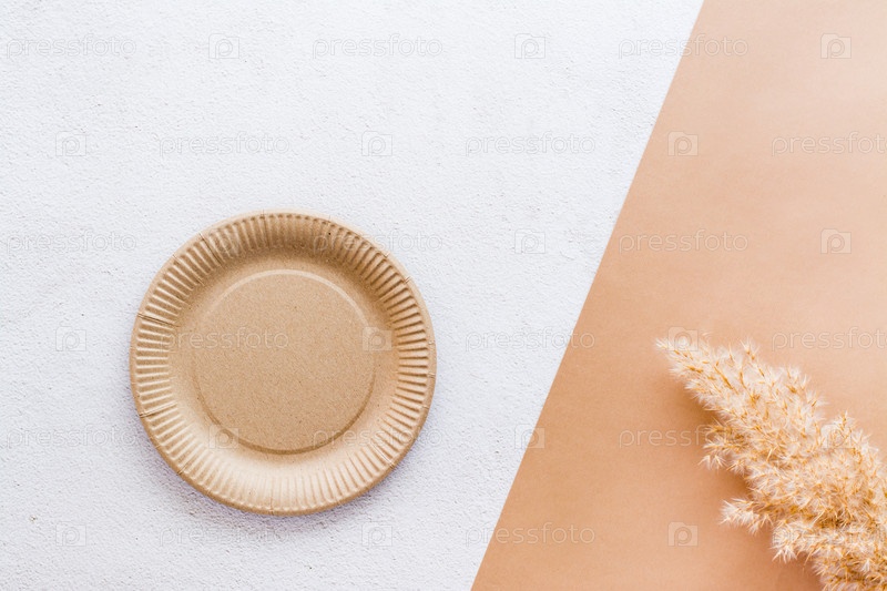 Концепция экологически чистой посуды для еды. Картонная тарелка и колосок на двухцветном фоне. Вид сверху