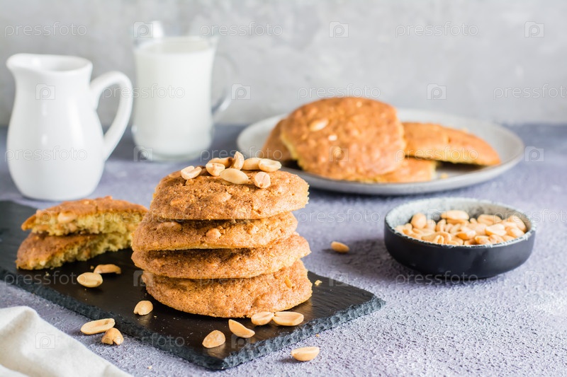 Стопка готового к употреблению свежего арахисового печенья на доске на столе. Домашняя выпечка. Копировать пространство