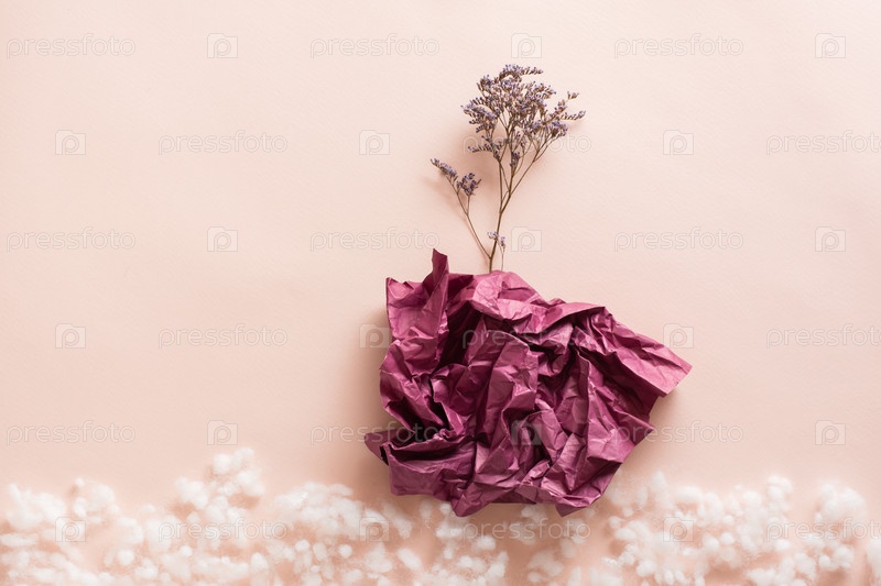 Концепция депрессии и застоя. Сухой цветок из комка бумаги на розовом фоне с пухом. Копировать пространство