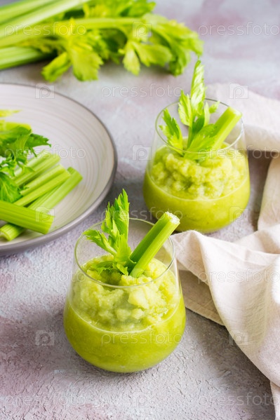 Смузи из свежего сельдерея в стаканах и ингредиенты для приготовления пищи на столе. Вегетарианская диета для детоксикации. Вертикальный вид