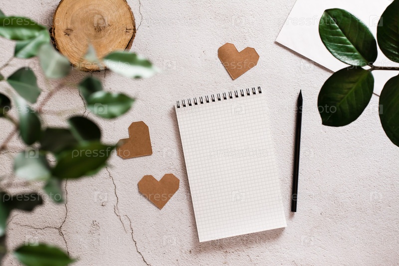 Эко макет. Откройте блокнот, карандаш и сделайте сердечки на светлом бетонном фоне и посадите домашние листья. Вид сверху