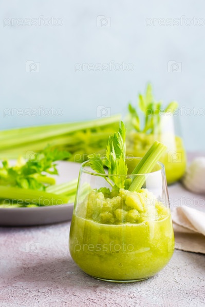 Два стакана со свежим сельдерейным смузи и ингредиентами для приготовления пищи на столе. Вегетарианская диета для детоксикации. Вертикальный вид