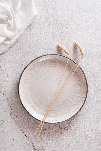 Эко макет. Уши на пустой тарелке и ткань на светлом бетонном фоне. Вид сверху и вертикальный