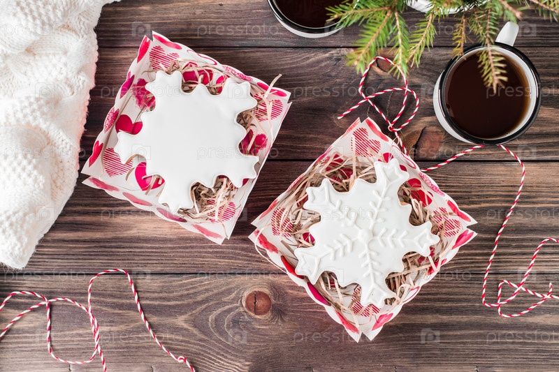 Пряничные снежинки с глазурью в открытых коробках и две кружки чая на деревянном столе. Рождественское угощение. Вид сверху