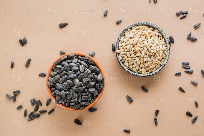 Выбирайте между очищенными и неочищенными семечками в мисках на столе. Природный источник витаминов и жиров. Вид сверху