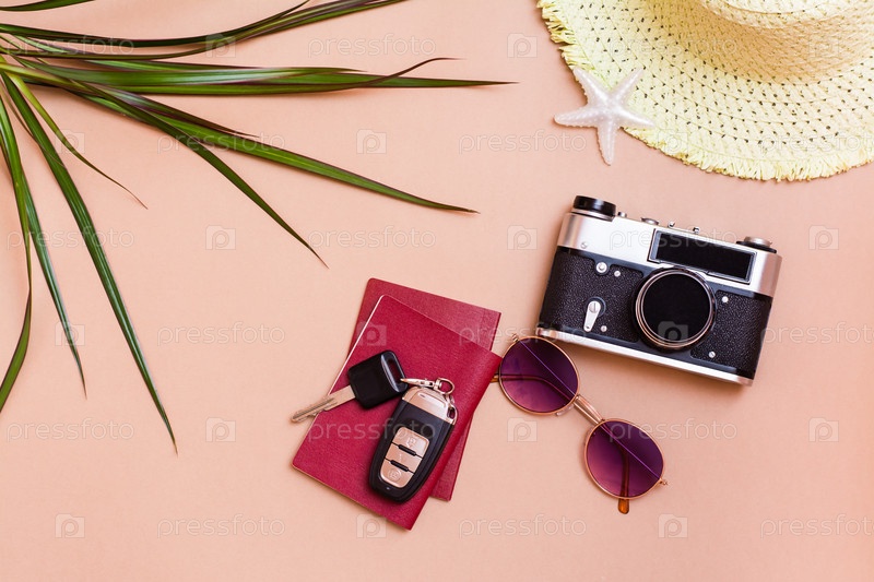 Летняя яркая дорожная квартира лежала с солнцезащитными очками, паспортами, ключами от машины, винтажной камерой и соломенной шляпой на бежевом фоне. Автомобильное путешествие. Вид сверху