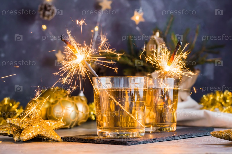 Горящие бенгальские огни в стаканах с коктейлями на рождественском столе. Золотая палитра