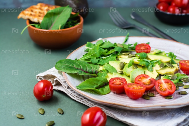Готовый к употреблению салат с авокадо, помидорами, листьями рукколы, мизуной, мангольдом и семенами тыквы на тарелке на зеленом столе. Вегетарианская витаминная пища. Копировать пространство