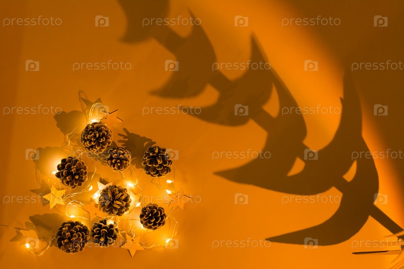 Рождество на закате. Оленья гирлянда, сосновые шишки и тень дерева в теплом оранжевом свете. Вид сверху