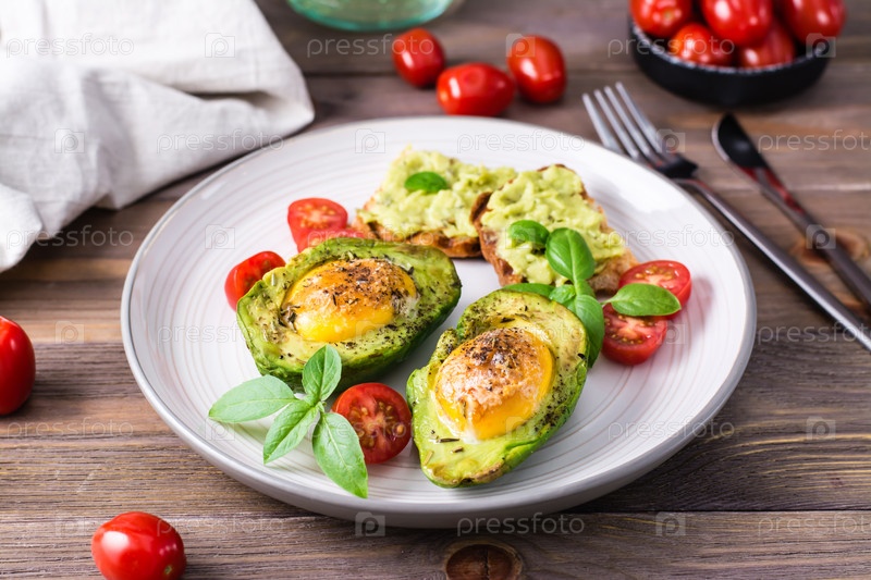 Готовая закуска из запеченного авокадо с яйцом, тостами и помидорами черри на тарелке на деревянном столе. Здоровое питание. Флекситарианская диета