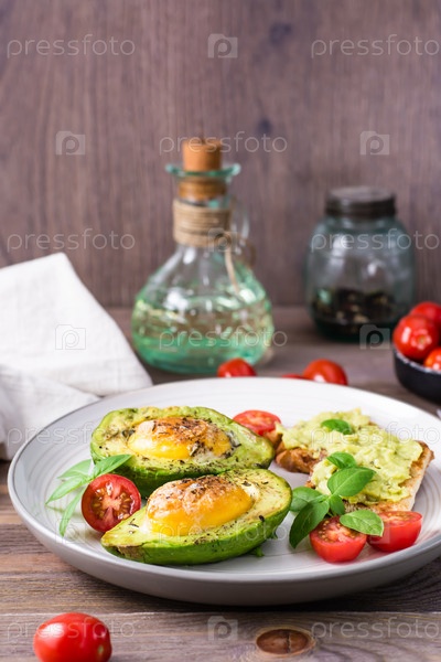 Горячая закуска, запеченная из авокадо с яйцом, тостами, помидорами черри и базиликом на тарелке на деревянном столе. Здоровое питание. Флекситарианская диета. Вертикальный вид