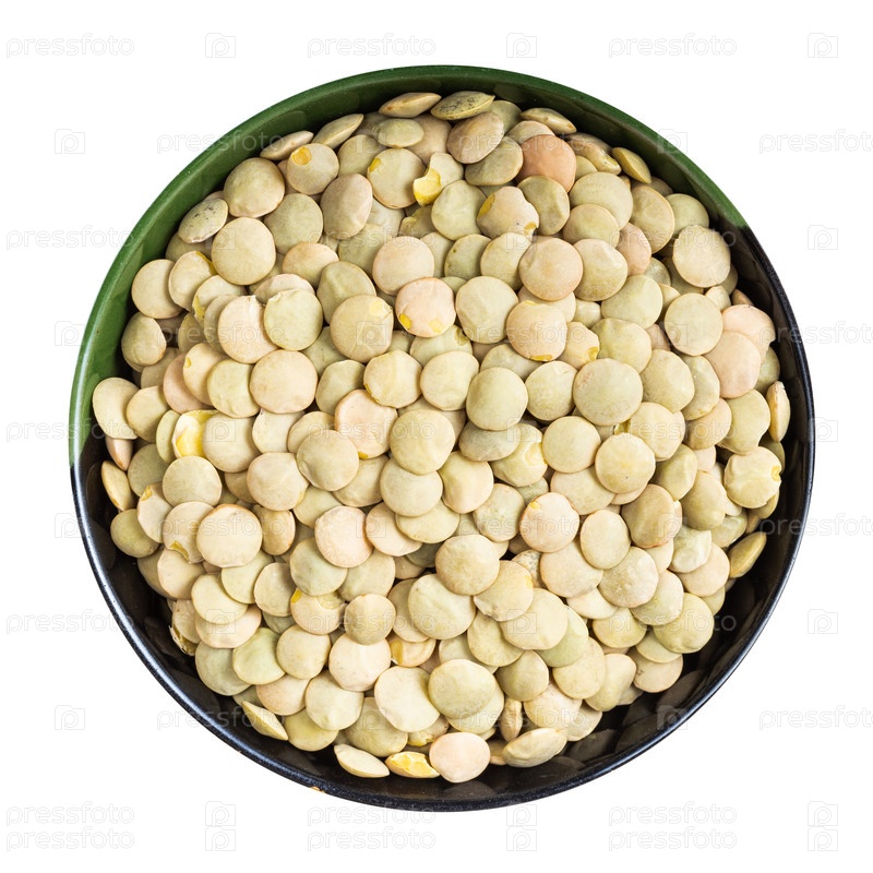 Целая светло-зеленая чечевица в круглой миске изолирована