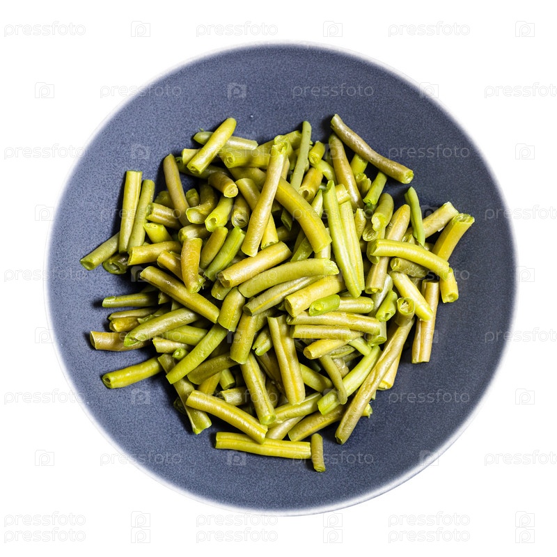 Вид сверху на вареную зеленую фасоль на изолированной тарелке