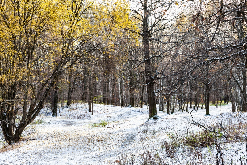 Пейзаж городского парка, покрытый первым снегом