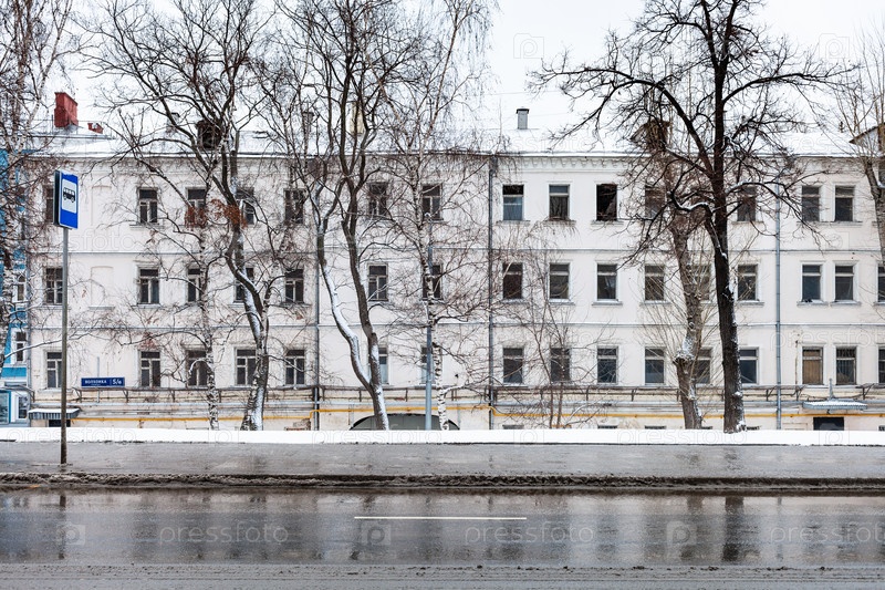 Городской пейзаж с мокрой дорогой и старым домом в Москве